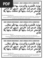 Niat ihram haji atau umrah ditambah dengan kalimat jika aku terhalang oleh sesuatu kesulitan maka tahallulku di mana saja aku menemui kesulitan. Niat umrah bersyarat bagi wanita. Kitab fiqh manhaji jilid 2 (haji). Perbedaan haji dan umroh dalam bentuk tabel. Niat dilafazkan di dalam hati.