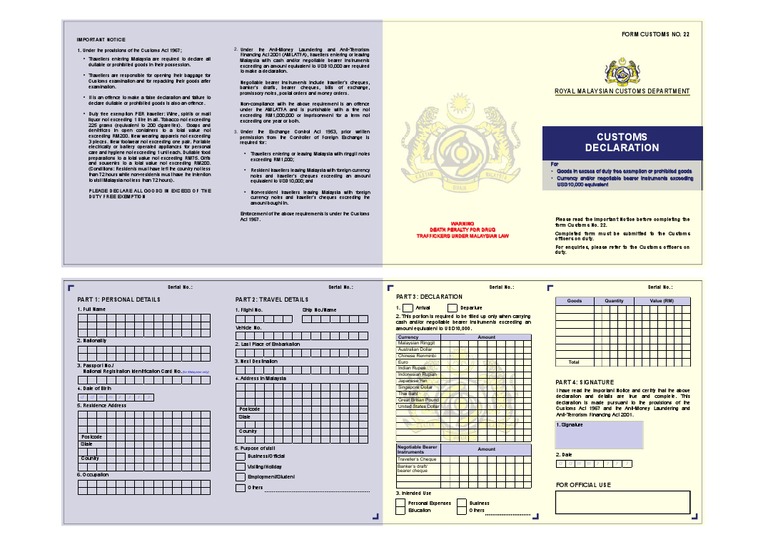 A customs declaration (cn23) is a customs document, used during international trade activities when goods are being transported overseas. 1 form or borang kastam no. The malaysian government issues the following types of visas to foreign nationals: Customs declarations prior to importing or exporting must also be filed, for security. If the goods are subject to control under custom (restriction of movement).