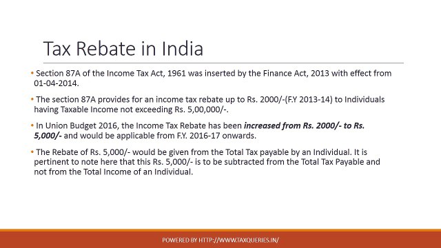 At the end of the fiscal year, they will receive the refund of tax. Following table shows the maximum rebate and maximum income(after deductions) for a resident individual across various years. Tax rebate is a refund on taxes when the tax liability is less than the taxes the individual has paid. The most common case of a tax rebate occurs when the individual taxpayer owes less than the sum of the total amount withheld from their incomes taxes. Tax rebates encourage taxpayers to make certain types of purchases or to stimulate a flagging economy quickly by getting cash into consumers' hands.